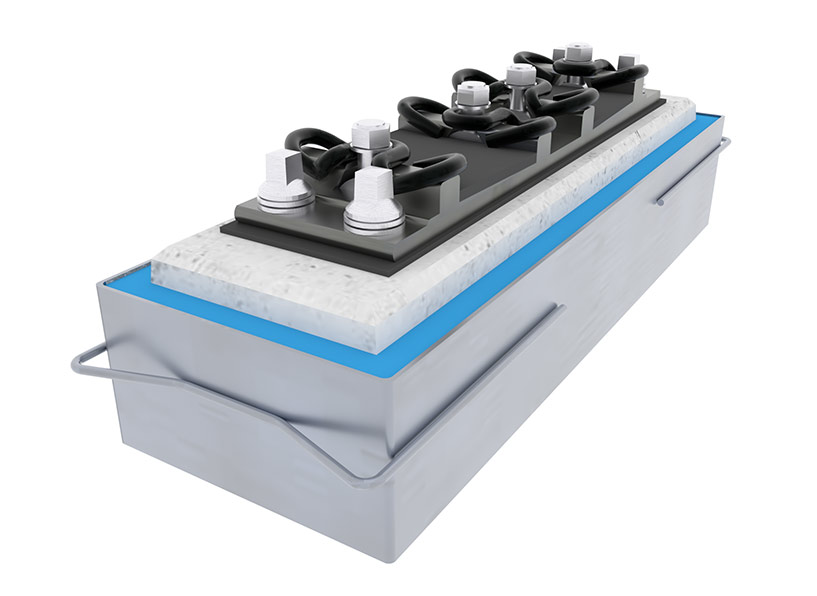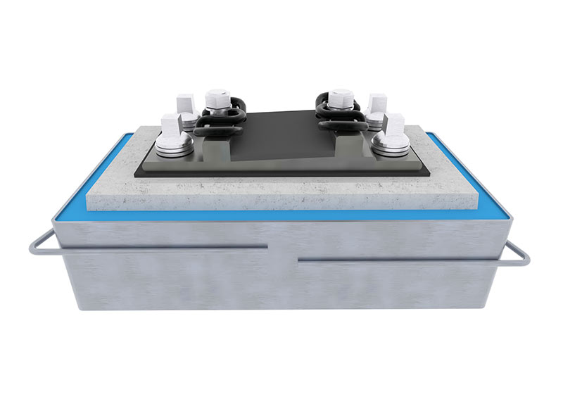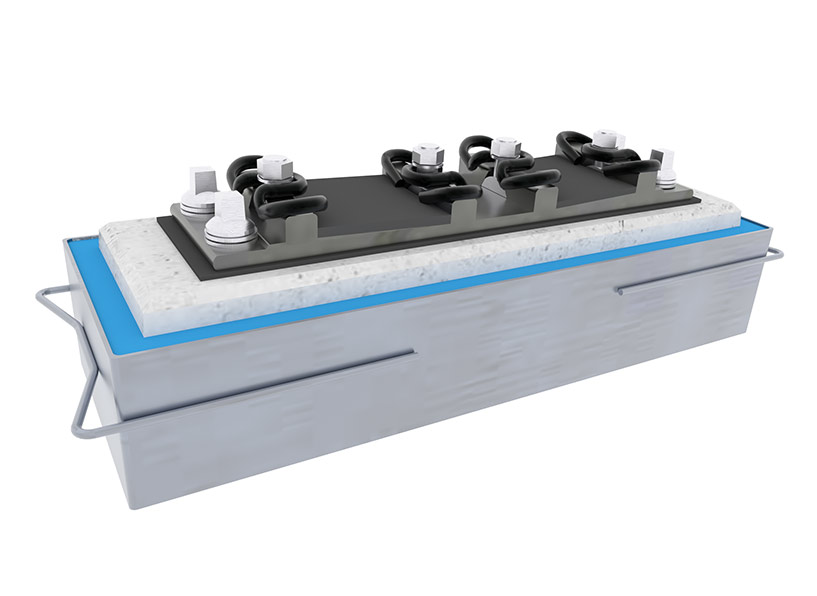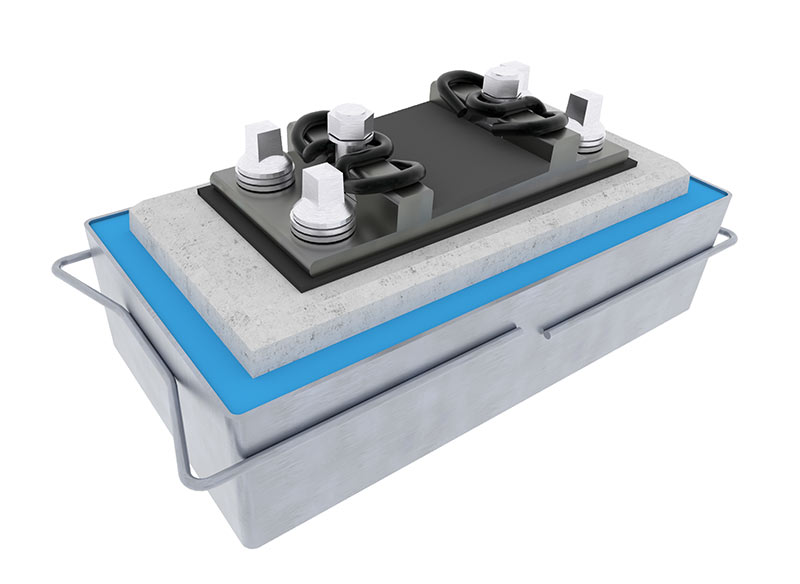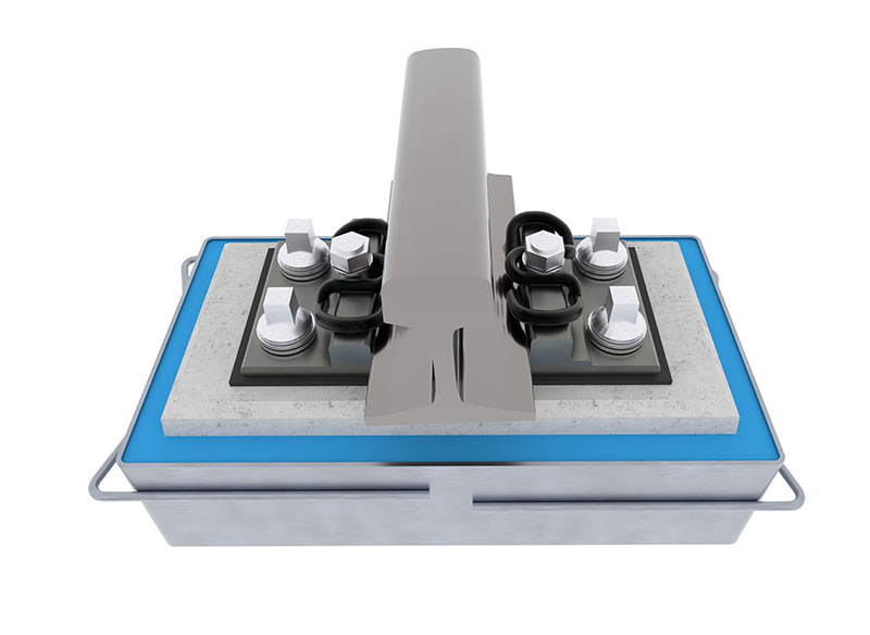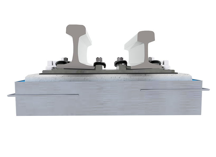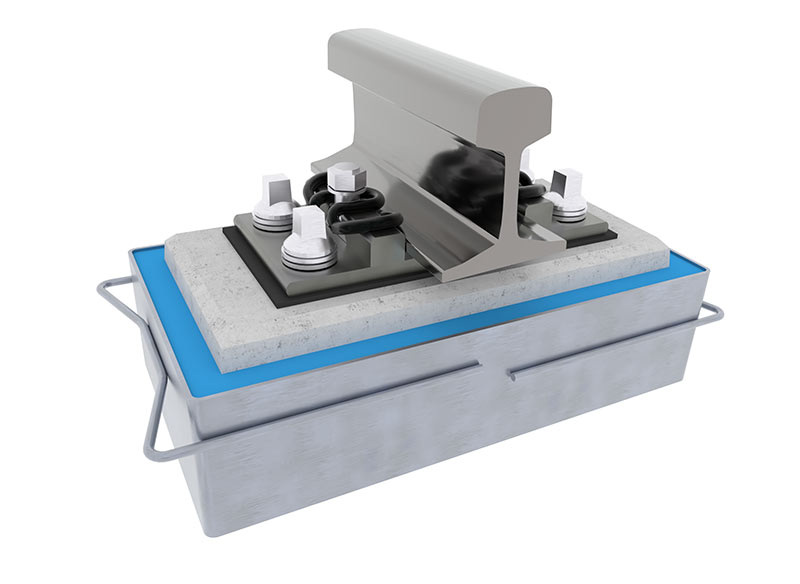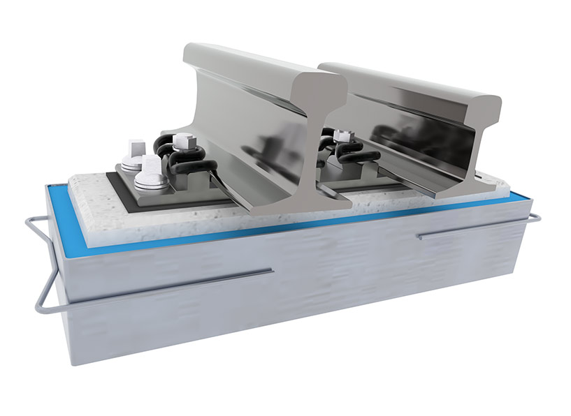 Rail block support with TINES® EBS-R casing – designed for use in turnouts and track crossings.