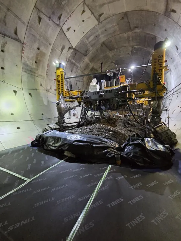 В безбалластных конструкциях маты обычно размещаются под бетонной плитой пути. Один из примеров — строительство диаметрального тоннеля в Лодзи, где маты TINES® Rubbermat уложены на основании и стенах обделки. Это решение снизит передачу вибраций с пути на конструкцию тоннеля и здания в непосредственной близости от линии. Работы выполнялись с применением современной технологии скользящей опалубки, что позволяет достичь высокой точности и оптимального прилегания мат к основанию.