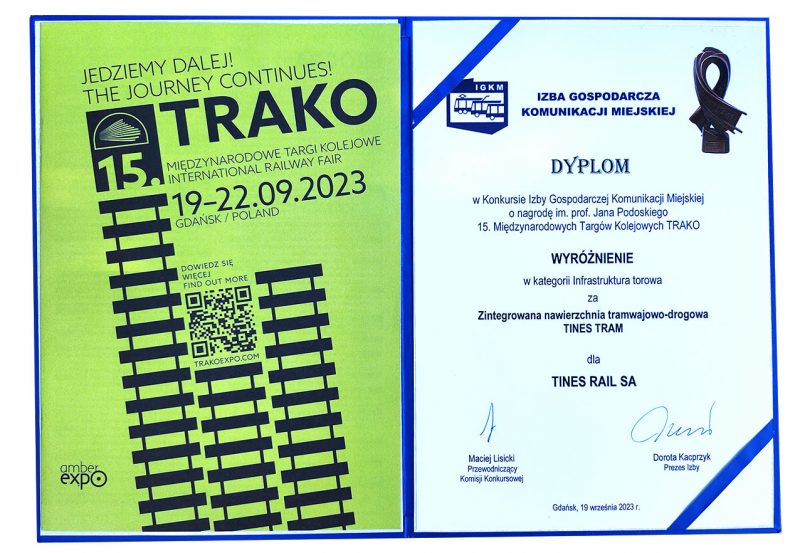 Система интегрированного трамвайно-автодорожного полотна TINES® TRAM получила признание на конрурсе имени проф. Яна Подоскего, организованной Торгово-промышленной палатой общественного транспорта.